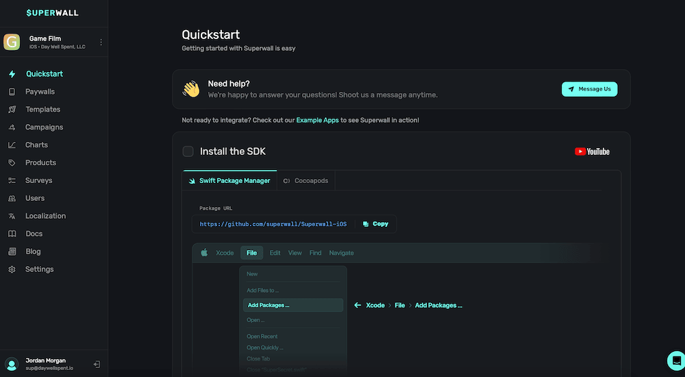When you log in for the first time or add a new app, the Overview page displays a Quickstart wizard to help you get up and running. Complete the interactive checklist to finish your Superwall integration: