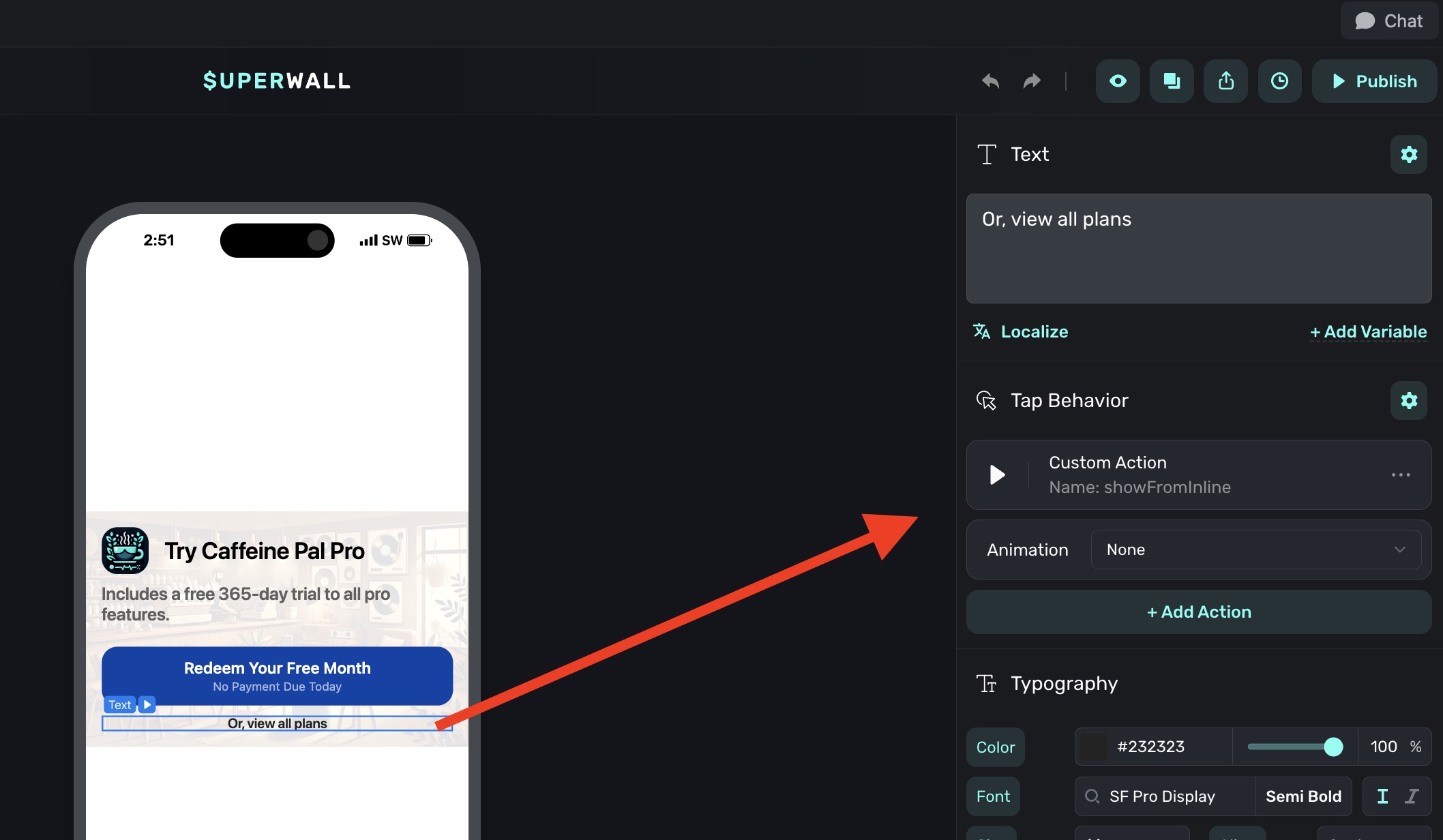 To get the inline paywall to trigger a second, full-screen paywall, create a custom action in the paywall editor in the embedded paywall. In this example, a custom action called "showFromLine" is triggered from the "or, view all plans" button: