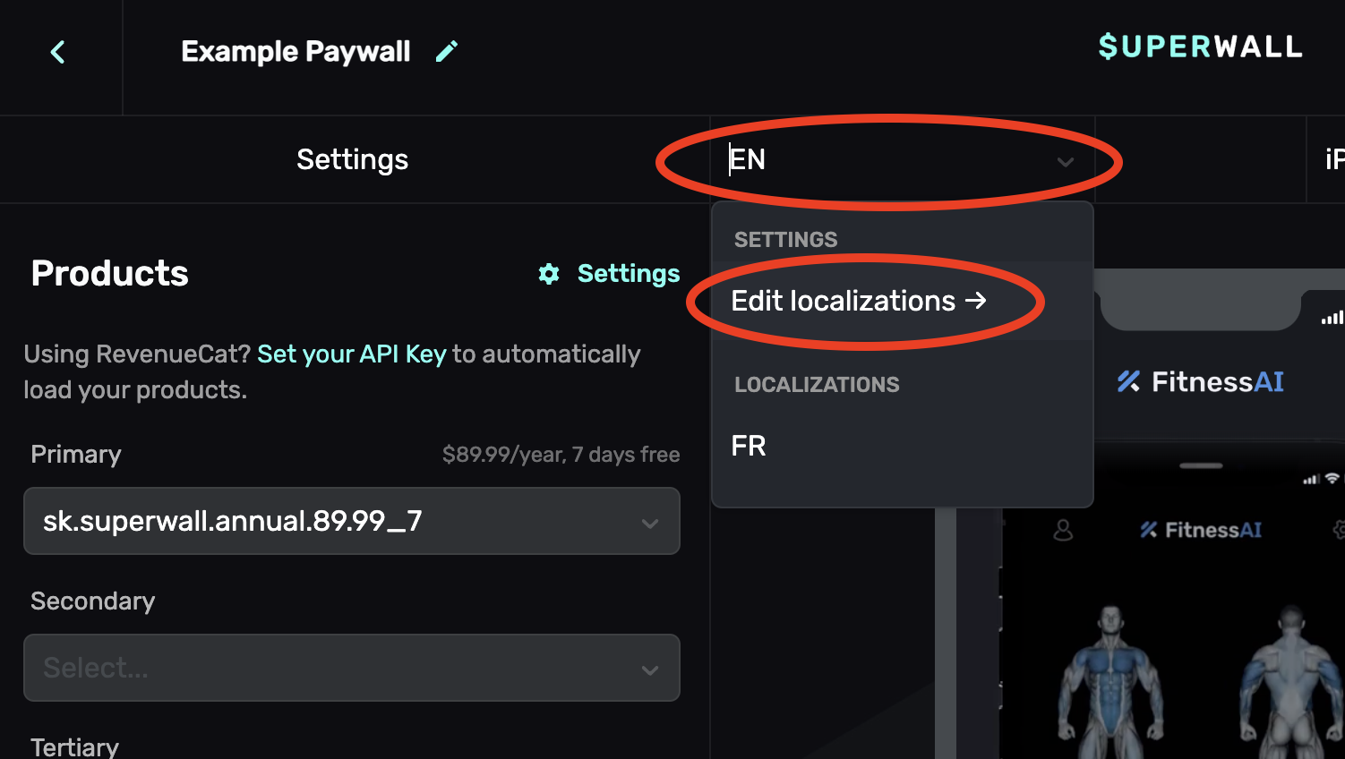 Select a paywall from the dashboard and click on EN to show the locale dropdown. Then click on Edit localizations ->: